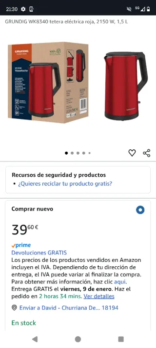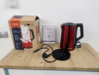 Tetera eléctrica Grundig de color rojo con capacidad de 1,5 litros. En su caja original, con su manual de instrucciones y a estrenar. Debido a un golpe presenta una imperfección la cual solo ha afectado al plástico embellecedor superior (van los trocitos cuidadosamente guardados por si alguien quiere pegarlos). Hago envíos y devoluciones.Posibilidad de recoger en Churriana o Albolote. Más artículos parecidos en mi perfil. - Potencia de 2150 W. - Diseño moderno y elegante.
