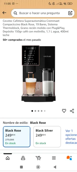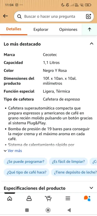 Cafetera superautomática Cecotec Compactccino en color Black Rose. Ideal para preparar café con grano recién molido. - Sistema Thermoblock. - 19 Bares de presión. - Depósito de 150gr de café en grano. - Depósito de agua de 1,1 L. - Depósito de leche de 400ml. Usado un par de veces ,como nueva. - El depósito de la leche tiene una pata rota pero funciona perfectamente llegó así cuando la compré.