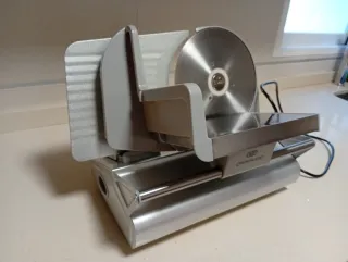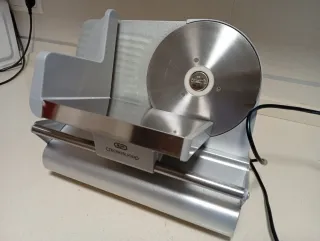 Cortafiambres eléctrico con un diseño moderno y funcional. Ideal para preparar tus propios embutidos y quesos en casa. - Acabado en plateado. - Cuchilla de acero inoxidable. - Base estable.