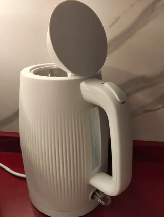 Hervidor eléctrico de color blanco con un diseño moderno y funcional. - Cuerpo con acabado acanalado. - Indicador de nivel de agua. - Tapa abatible.
