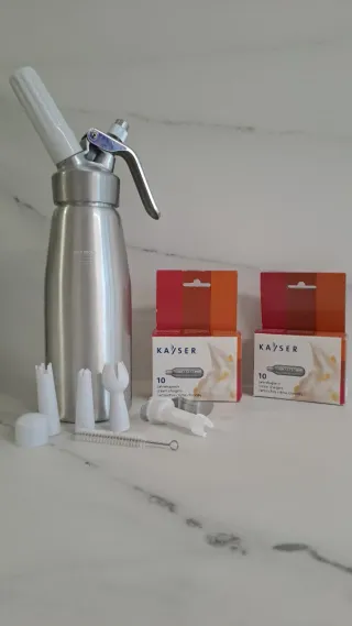 Sifón de acero inoxidable para preparar cremas, espumas y nata montada. Incluye varios accesorios para diferentes decoraciones. Se ha usado solo 1 vez. - Sifón de acero inoxidable. - Boquillas decorativas. - Cepillo de limpieza. - Cartuchos de gas (18 cartuchos).