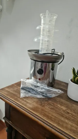 Fuente de chocolate de acero inoxidable con torre de plástico. - Torre de plástico desmontable. - Base de acero inoxidable. - Incluye accesorios de limpieza.