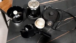 Cafetera eléctrica Ariete Moka Aroma de color negro. Ideal para preparar café. Funciona perfectamente pero me rompieron el mango como se ve el la foto. Para manitas o salir del paso... - Base eléctrica. - Cafetera de aluminio. - Jarra. - Filtro.