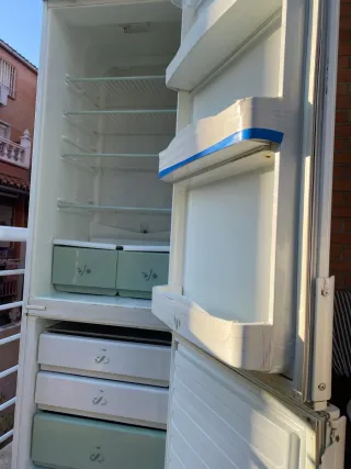 Frigorífico de color blanco, funciona muy bien. - Puerta con compartimentos. - Estantes interiores. - Cajones para verduras.