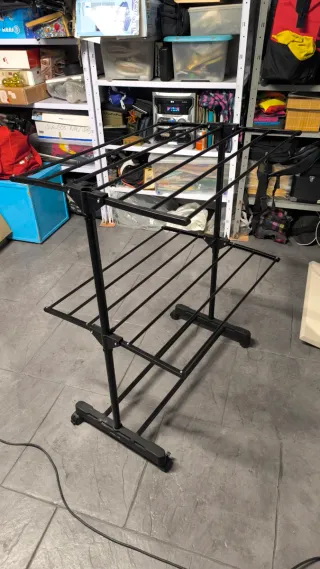 Tendedero plegable de metal negro, ideal para secar ropa en interiores o exteriores. Fácil de mover gracias a sus ruedas. - Estructura metálica resistente. - Diseño plegable para ahorrar espacio. - Ruedas para facilitar el transporte.