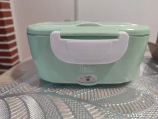 Fiambrera eléctrica de color verde menta, ideal para llevar tus comidas al trabajo o de viaje. Contiene cubiertos de acero inoxidable y cable para el coche. En perfecto estado, solo usada una vez .