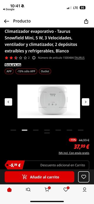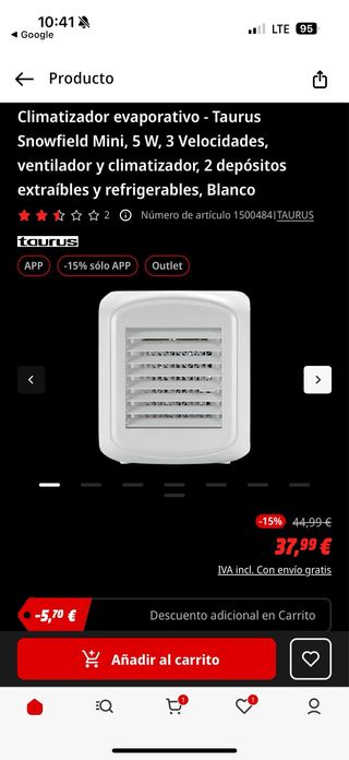 Climatizador evaporativo Taurus, en perfecto estado. - Funciona perfectamente. - Diseño elegante y compacto. - Ideal para refrescar espacios pequeños. Taurus modelo Alpatec R850. Comprado finales de verano 2024 Características. Diseño ecológico Mando distancia, función timer, oscilación,enfríar /humidificar Potencia 80w