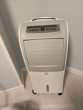 Climatizador evaporativo Purline Rafy SC con acabado en color blanco y una potencia de 140 W. Tiene una capacidad de 5 litros en el depósito de agua extraíble. Cuenta con temporizador, 4 velocidades y 4 ruedas. Mando a distancia incluido. Medidas: 27 x 79 x 27 cm (ancho x alto x fondo). Usado pocas veces, antes de instalar el aire acondicionado. Precio original en tienda es de 229 euros.