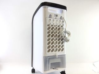 Climatizador evaporativo de la marca MCONFOR, en color blanco y fabricado en plástico. Es un aparato en buen estado, listo para usar. - Dispone de dos ventiladores. - Incluye mando a distancia. - Tiene una pantalla LED.