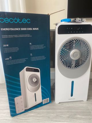 Ventilador - Climatizador evaporativo Cecotec EnergySilence 5000 Cool Wave. - Potencia de 28 W con motor DC - Capacidad de 5 L. - Pantalla táctil LED. - 12 velocidades. - 3 modos. - Temporizador hasta 9h. - Incluye mando a distancia y un enfriador. - Ruedas sin usar Dispongo de dos unidades. Uno de ellos utilizado durante un par de semanas, ya que lo adquirimos porque se nos estropeó el aire acondicionado. - Usado 50€ - Nuevo 70€ Su precio es de 100€ en Amazon Funciona muy bien y refresca el ambiente. Se utiliza llenando el depósito de agua fría + enfriador o hielo Los entrego en su caja original con instrucciones