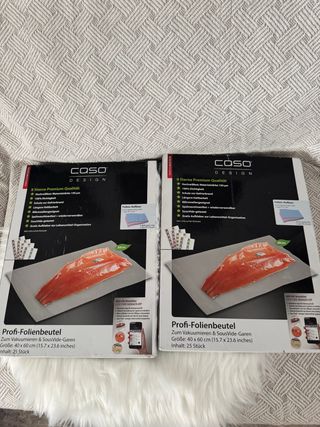 Pack de 25 bolsas para envasado al vacío de la marca CASO. - Tamaño: 40 x 60 cm (15.7 x 23.6 inches). - Material de alta calidad. - Aptas para cocción Sous Vide. - Reutilizables y aptas para lavavajillas. Nuevas a estrensr