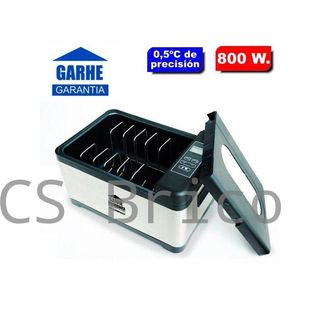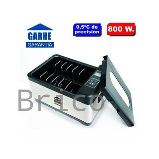 Equipo de cocción al vacío de la marca Garhe. Incluye cubeta sous vide con control preciso de temperatura, capacidad de 10 litros y potencia de 800 w. Incluye también envasadora de vacío. - Diseño compacto y moderno. - Acabado en acero inoxidable.