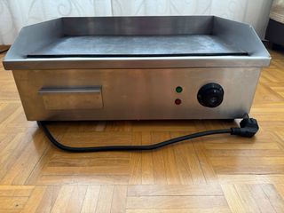 Plancha industrial eléctrica de la marca Mainho. Fabricada en acero inoxidable, cuenta con una superficie de cocción lisa y dos mandos para regular la temperatura. - Material: Acero inoxidable. - Superficie de cocción lisa. - Dos mandos de control.