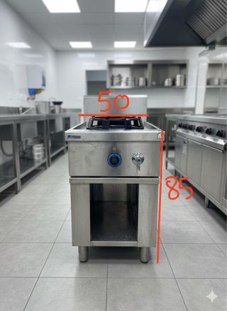 Fogón profesional de la marca NTGAS, ideal para cocinas industriales o negocios de hostelería. Fabricado en acero inoxidable. - Medidas aproximadas: 50 cm (ancho) x 85 cm (alto). - Encimera de acero inoxidable. - Quemador de alta potencia. Medidas También el la Foto