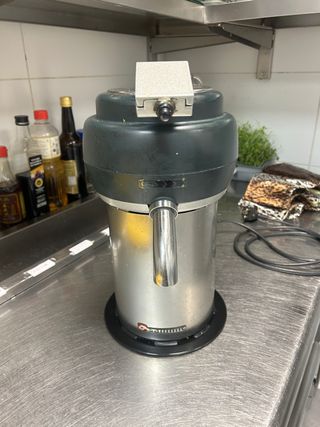 Exprimidor profesional de naranjas, ideal para negocios. - Diseño robusto y duradero. - Acabado en acero inoxidable y plástico negro. - Grifo dispensador. Su precio es 568€ ( puedes verlo en la factura) 2 años de antiguedad, pero con muy poco uso