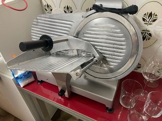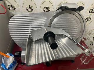 Cortadora eléctrica profesional para carnes y embutidos. Ideal para uso doméstico o comercial. - Cuchilla de acero inoxidable. - Protector de cuchilla. - Bandeja de corte. - Base antideslizante. Afilador