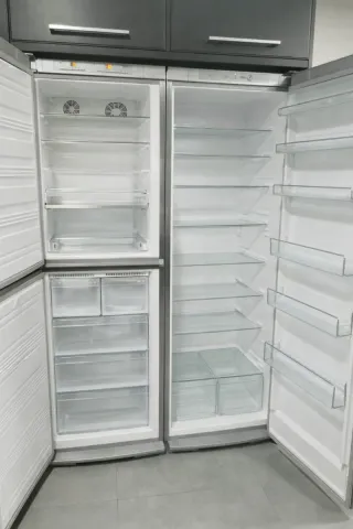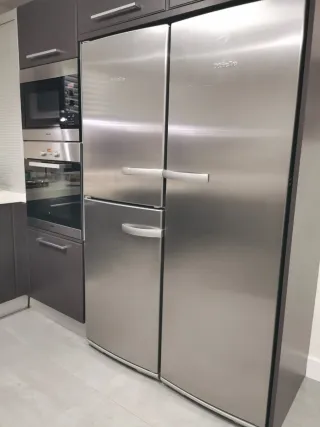 Nevera combi de la marca Miele en acabado de acero inoxidable. Diseño moderno y elegante. - Acabado en acero inoxidable. - Tiradores integrados. Frigorífico doble Miele en excelente estado, prácticamente como nuevo. La parte derecha es un frigorífico completo con varias baldas y cajones. La parte izquierda se divide en dos zonas: zona cero superior para alimentos frescos y congelador inferior con cajón y generador de cubitos de hielo.