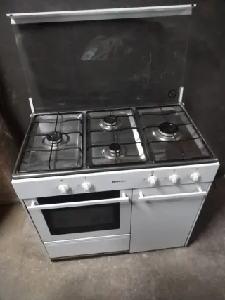 Cocina a gas butano de 5 fuegos con práctico alojamiento porta bombonas. Horno a gas de 64 litros, quemador inferior a gas y grill a gas. Tapa abatible en vidrio. Seguridad de llama por termopar en todos los quemadores. Tienes 2 año s y medio usada por una persona mayor solo rl primer año. Funciona perfectamente. Medidas 90x60x80