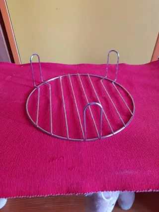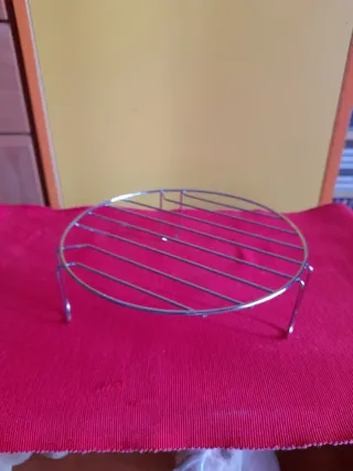 Rejilla redonda de metal cromado, ideal para usar en microondas con función grill. Es un accesorio de metal diseñado para elevar los alimentos y acercarlos al elemento calefactor del grill en un microondas. Permite dorar y cocinar alimentos de manera más uniforme y crujiente, similar a un horno convencional. Se utiliza comúnmente con la función de grill del microondas. - Diámetro: 21 cm. - Altura de las patas: 7 cm. - Material: Metal cromado.