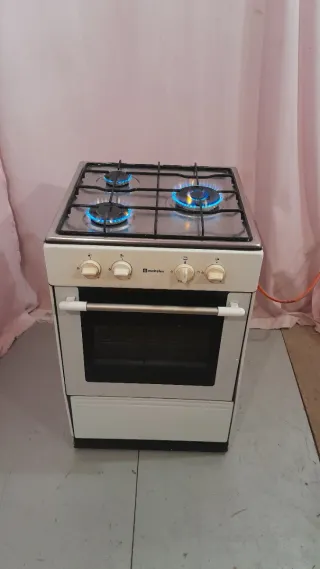 Cocina de gas con horno, ideal para usar con bombona de butano. Cuenta con cuatro quemadores en la parte superior y un horno gas funciona de maravilla Tiene la pintura un poco mal si ve en las fotos pero la cocina funciona perfectamente usada muy poco - Encimera de acero inoxidable. - Mandos frontales tiene sistema seguridad de gas revisada por técnico lista para usar - Puerta del horno con cristal.