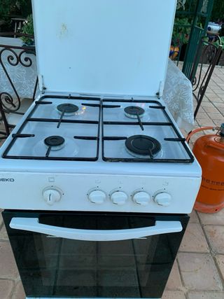 Cocina de gas Beko en color blanco, ideal para usar con bombona de butano. - Encimera de gas con cuatro fuegos. - Horno con puerta de cristal. - Mandos frontales para controlar la temperatura y los fuegos. Solo atiendo teléfono 607 409 783