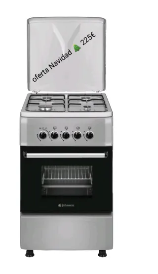Cocina Johnson COCI50GX. / Cocina Johnson COCI50BX Encimera de gas con 4 zonas de cocción Horno de gas con capacidad de 55 litros. Autoencendido en la encimera Horno con quemador superior grill. Preparada para Gas natural Kit de gas butano incluido Dimensiones (Al×An×Fonxcm): 87×50×58.2 Con garantía de 3 años.. Estamos en C.a.s.a.n.o.v.a 3. 0.8.0.1.1. B.a.r.c.e.l.o.n.a WhatsApp 6.2.7.0.0.6.2.5.9