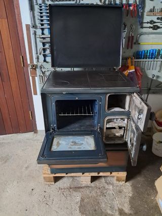 Cocina de leña clásica, ideal para calentar y cocinar. - Encimera de hierro fundido con círculos. - Puerta del horno con cristal. - Termómetro integrado en el horno. - Marca: Wamster.