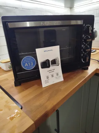 Vendo horno de sobremesa Grunkel HR-23 en perfecto estado y muy poco uso. Es muy potente (1600W) y calienta rapidísimo. Capacidad: 23 Litros. Funciones: 3 modos de calor para asar, tostar o calentar. Control: Temperatura regulable hasta 230°C y temporizador de 60 min con aviso. Estado: Muy limpio y listo para cocinar desde el primer día.