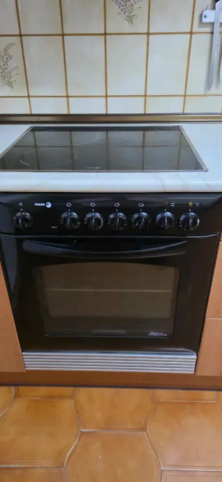 Horno de cocina de la marca Fagor en color negro. Cuenta con una placa vitrocerámica superior. - Encimera vitrocerámica con cuatro fuegos. - Mandos frontales para control de temperatura y funciones. - Puerta del horno con cristal. - Diseño moderno y elegante.