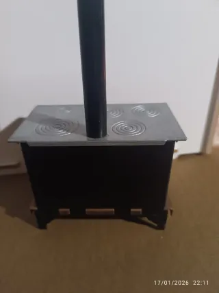 Miniatura de una cocina de hierro con detalles. - Diseño de estufa clásica. - Chimenea negra. - Superficie con círculos decorativos.