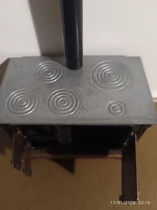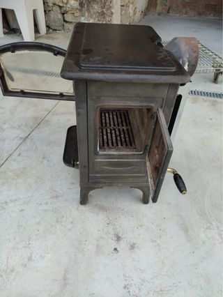 Estufa antigua de hierro fundido con un diseño clásico y ornamentado. Su estructura robusta y detalles decorativos la convierten en una pieza única. - Acabado en negro brillante. - Base con detalles calados. - Parte superior con rejilla metálica.