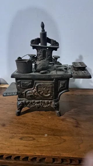 Detallada cocina económica en miniatura, fabricada en hierro fundido. Presenta un diseño clásico con todos sus accesorios. - Incluye cubeta, tetera y sartén. - Bandeja lateral con moldes para magdalenas. - Inscripción 'RESCENT' en el frontal.