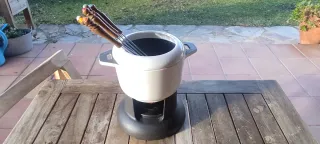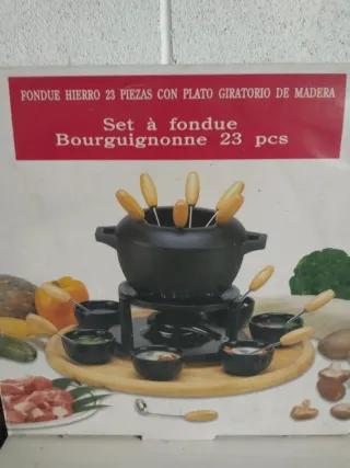 Se vende fondue bourguignonne de 23 piezas con plato giratorio de madera. SIN ESTRENAR 1 recipiente de hierro 1 tapa de hierro 1 soporte 1 plato giratorio de madera 1 quemador de alcohol 6 tenedores 6 salseras de cerámida 6 cucharillas