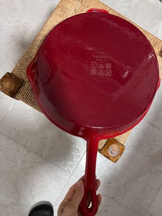 Sartén hierro fundido 28cm diametro de la marca Ernesto en un llamativo color rojo. Nunca se ha usado. - Diseño clásico con mango. - Apta para diversas fuentes de calor.