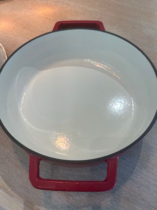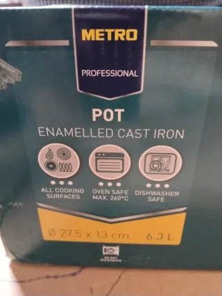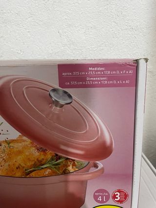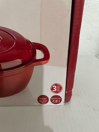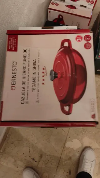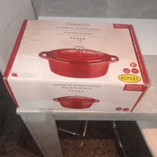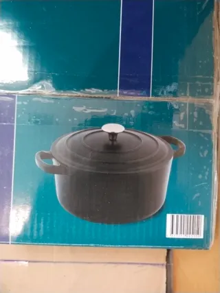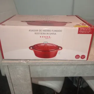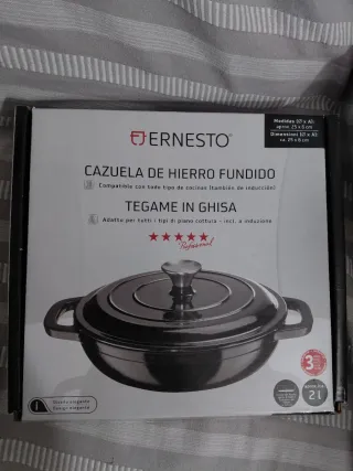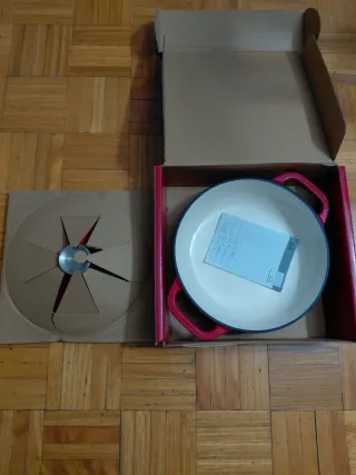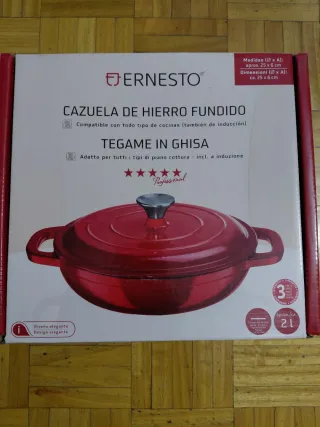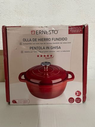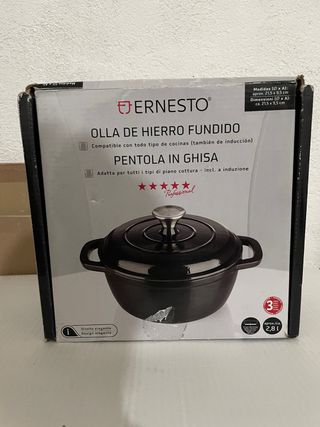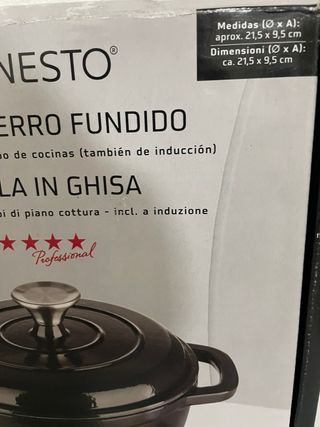 Olla de hierro fundido sin estrenar. La compré pensando que era más grande y no la puedo devolver. Está precintada y por eso las fotos son de la caja. En Amazon son 41€ Es para fuego de 20cm