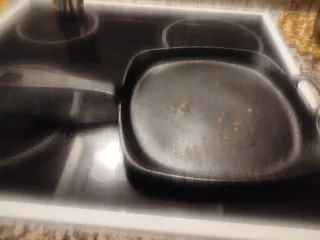 Placa de asar de hierro fundido especialmente diseñada para cocinas de inducción. Superficie combinada: una mitad con costillas tipo grill para marcar carnes y otra plana y lisa para verduras y alimentos delicados. Medidas: 43,6 × 22,9 × 3,7 cm; peso: 5 kg. Fabricada en hierro fundido de alta resistencia, recubierta con esmalte mate negro de base antiadherente que facilita la limpieza y mejor distribución del calor. Compatible con placas de inducción (incluidas aquellas con zona flexible). Posee patas que elevan ligeramente la plancha para evitar dañar el vidrio de cocción. Estado: ver fotos, nueva, sin defectos funcionales.