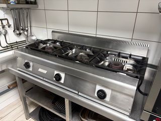 Cocina industrial con seis quemadores. - Superficie de acero inoxidable. - Parrillas de hierro fundido. Posibilidad de transporte
