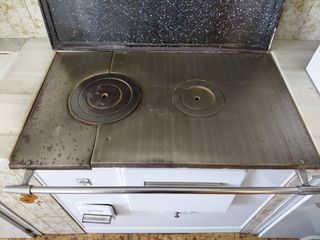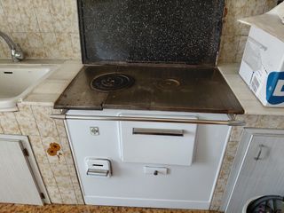 Cocina de carbón o leña. Antigua, estilo bilbaina, con encimera de hierro fundido. - Encimera con dos fuegos redondos. - Puerta del horno frontal. - Acabado exterior en blanco esmaltado. El comparador desmonta y transporta. Unicamante a recoger. En Léon capital
