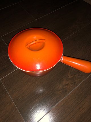Cazo con tapa de hierro fundido Le Creuset. - Color naranja vibrante. - Asa integrada para un agarre cómodo. - Tapa con pomo para facilitar su levantamiento.