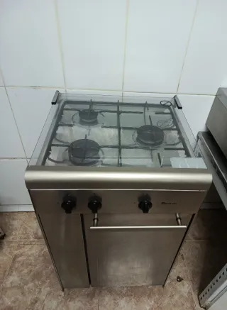 Cocina industrial de gas con tres fogones y horno. - Superficie de acero inoxidable. - Parrillas de hierro fundido. - Encendido electrónico.