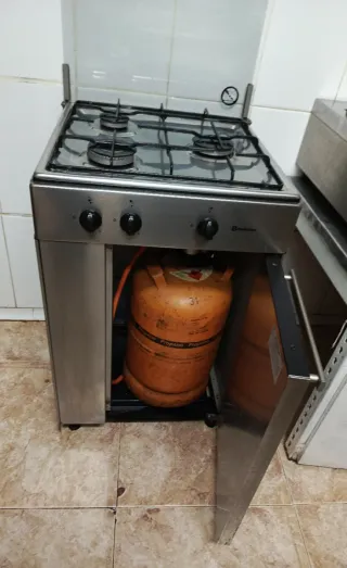 Cocina Cointra con combinación de gas y eléctrica. Medidas: 60×50 cms. - Encimera de acero inoxidable. - Cuatro fuegos (3 de gas y 1 eléctricos). - Mandos frontales. - Parrillas de hierro fundido.