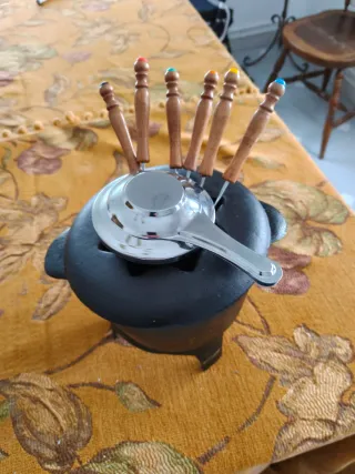 Set de fondue de los 80's sin estrenar. Compuesta por - Cazuela de hierro con tapa.(adjunto fotos para mostrar a detalle su estado). - Patas de hierro fundido. - 6 pinchos personalizados con punto de color. - Quemador. - Base de madera (rayada en la parte posterior, adjunto foto). Aunque no se ha usado nunca, el relieve decorativo muestras el paso del tiempo. (Adjunto fotos de todos los lados).