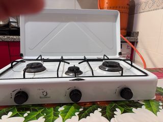 Cocina de gas portátil con 3 quemadores, ideal para espacios pequeños. Funciona con bombona de butano. - Diseño compacto y ligero. - Encendido manual. - Parrilla de hierro fundido.