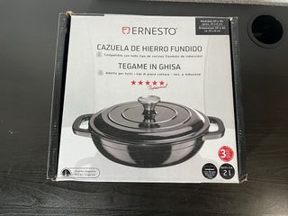 Cazuela de hierro fundido de la marca Ernesto, con una capacidad de 2 litros. Es apta para todo tipo de cocinas, incluyendo inducción. - Diseño clásico y elegante. - Asas integradas para un fácil manejo. - Apta para lavavajillas.