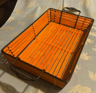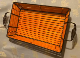 Cesta decorativa con un diseño moderno y llamativo. - Estructura de metal negro. - Laterales y base de tiras de bambú naranja. - Asas laterales de metal con diseño en espiral.