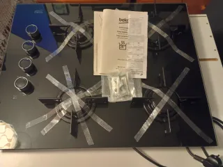 Piano de cocina a gas de la marca Beko. Superficie de cristal negro. - Encendido electrónico. - Parrillas de hierro fundido. - Válvulas de seguridad.Piano cottura a gas Beko in colore nero. - Piano in vetro. - Bruciatori a gas. - Comandi frontali.