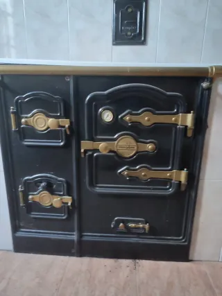 Cocina de hierro Hergom Lacunza L-07/90 CC. Pieza de hierro fundido con detalles ornamentales dorados y un acabado negro brillante, reforzada. - Puerta principal con cierre y detalles decorativos. - Compartimentos laterales con rejillas y tiradores. - Placa decorativa con el logo de Hergom. - Barra frontal dorada. NUEVA VALE 4500 euros Se puede negociar, mejor ver en persona, tiene sus años pero funciona perfectamente, solo habria que limpiarla un poco.