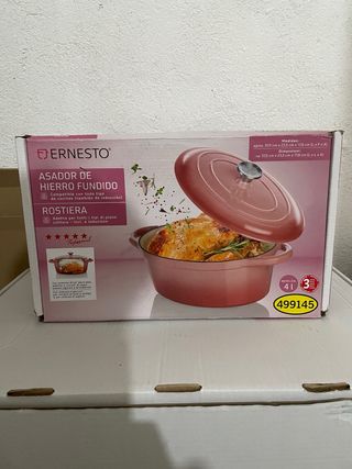 Olla asador de hierro fundido de la marca Ernesto. Su diseño ovalado y su color rosa la hacen destacar en cualquier cocina. - Capacidad de 4 L. - Apta para todo tipo de cocinas, incluida inducción. - Dimensiones: aprox. 37,5 cm x 23,5 cm x 17,8 cm (Largo x Fondo x Alto).