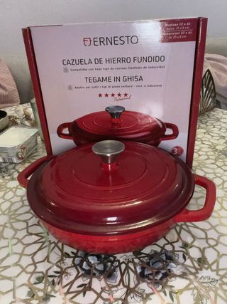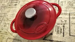 Olla de hierro fundido de color rojo degradado, con asas laterales y tapa a juego. Interior negro, altura 12cm sin la tapa. Fondo de 20cm. Se recomienda para su mejor conservación, cuando no se use, ponerle una fina capa de aceite (ahora mismo no tiene).