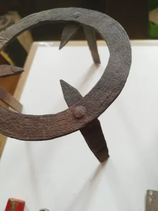 Trébede antigua de hierro forjado, ideal para dar un toque rústico a tu hogar o cocina. 13 x 18 diámetro - Fabricada en hierro. - Diseño circular con patas.